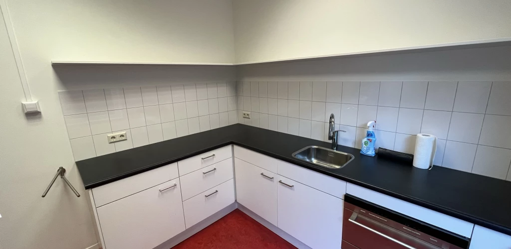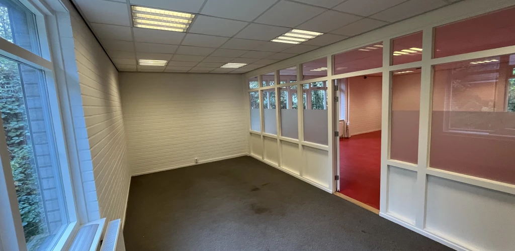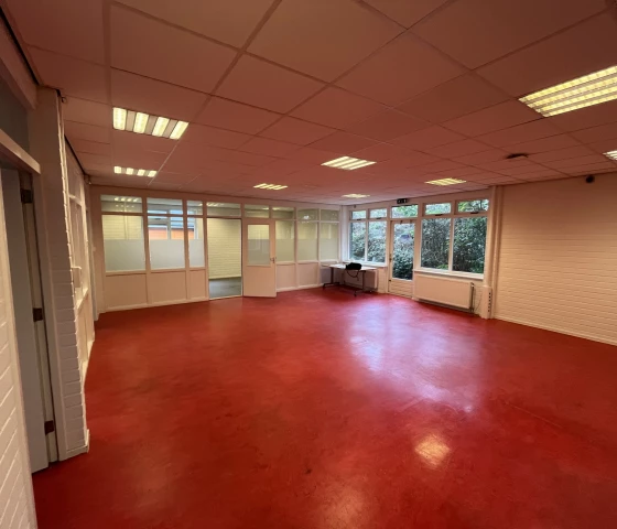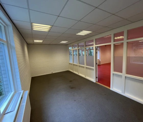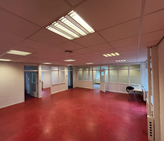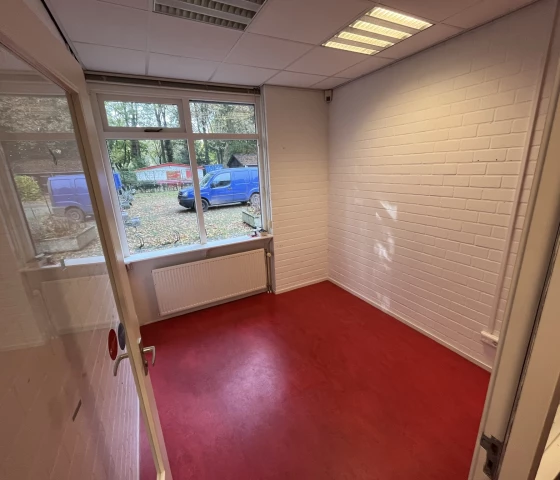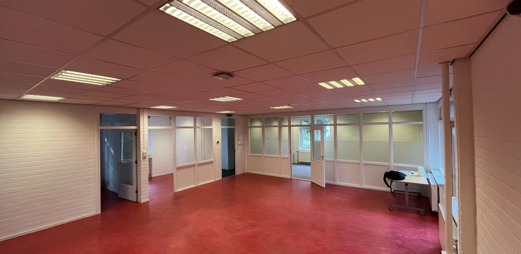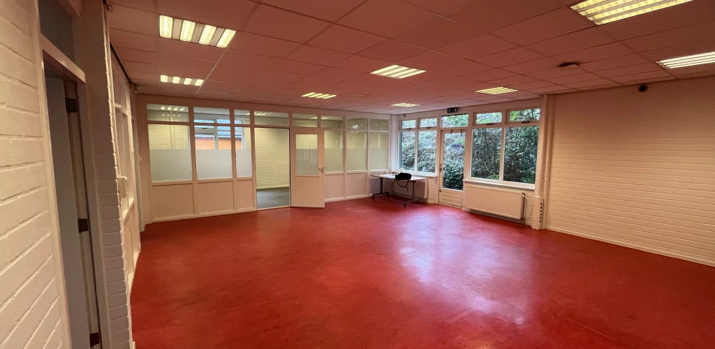Via de hal komt u in een grote open ruimte met aangrenzende kantoor- en vergaderruimte en eenvoudige keuken. Direct grenzend aan de hal bevinden zich drie toiletten. Een meterkast is aanwezig. Via de vlizotrap bereikt u de opslagzolder. Alle gevelopeningen zijn voorzien van elektrische rolluiken.