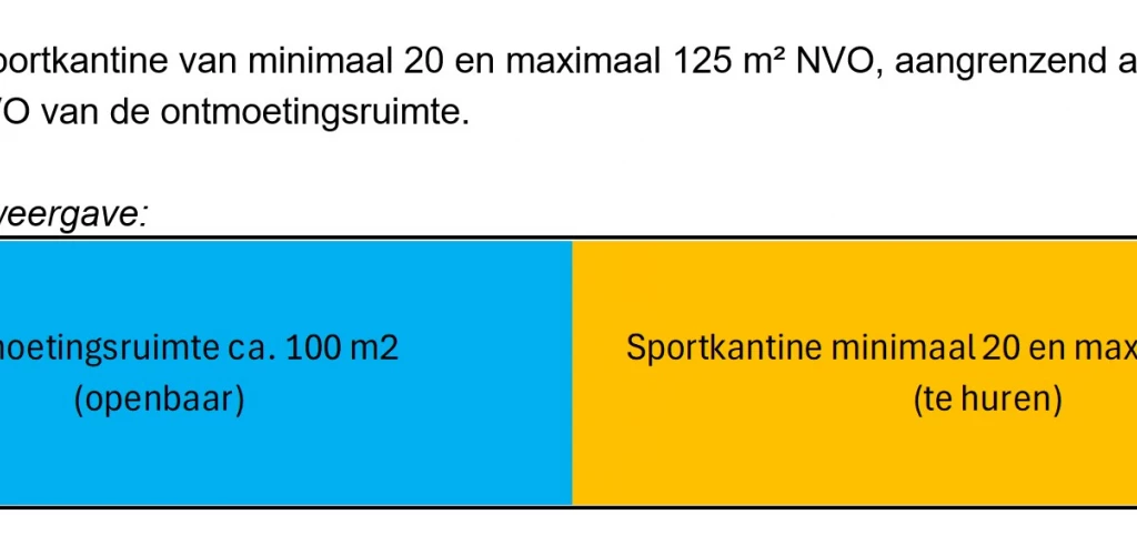 Sportkantine van minimaal 20 en maximaal 125 m² NVO die afsluitbaar is en grenst aan de ontmoetingsruimte. In de sportkantine kan huurder eten en drinken verkopen aan leden en andere bezoekers.
